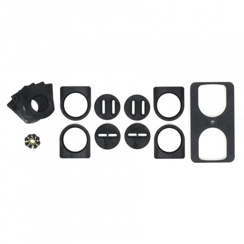 The Voile Canted Puck Package includes 4 canted pucks, 4 puck gaskets, 2 in-line slot discs (with support posts), 2 parallel slot discs (with support posts), 8-M6x1.7mm pan head screws, and a puck alignment guide.